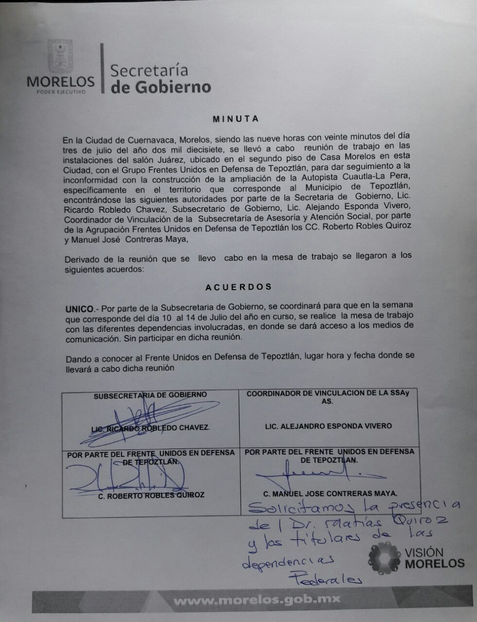 Los integrantes del FUDT y testigos de la sociedad civil están en las oficinas del Subsecretario de gobierno, Rícardo Robledo, exigiendo que se cumplan los acuerdos de la minuta del 3 de julio. No se retirarán hasta tener fecha y hora por escrito del diálogo en el cual debe estar presente el secretario de gobierno, Matías Quíroz, y los titulares de todas las instancias involucradas.