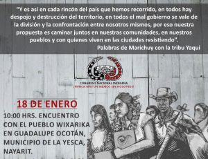 «Y es así en cada rincón del país que hemos recorrido, en todos hay despojo y destrucción del territorio, en todos el mal gobierno se vale de la división y la confrontación entre nosotros mismos, por eso nuestra propuesta es caminar juntos en nuestras comunidades, en nuestros pueblos y con quienes viven en las ciudades resistiendo». Marichuy, Tribu Yaqui.