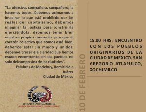 «La ofensiva, compañera, compañero, la hacemos todos. Debemos animarnos a imaginar lo que está prohibido por las reglas del capitalismo, debemos imaginar la justicia para construirla ejerciendola, debemos de tener bien nuestros propios corazones para que el corazón colectivo que somos este bien, debemos estar sin miedo y unidos, debemos crecer esa claridad que hemos estado encontrando en los pueblos no solo en el campo sino en las ciudades». Palabras de Marichuy en el Hemiciclo a Juárez, Ciudad de México.