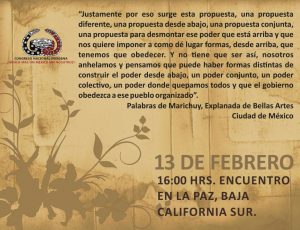 «Justamente por eso urge está propuesta, una propuesta diferente, una propuesta desde abajo, una propuesta conjunta, una propuesta para desmontar ese poder que está arriba y que nos quiere imponer a como de lugar formas, desde arriba, que tenemos que obedecer. Y no tiene que ser así, nosotros anhelamos y pensamos que puede haber formas distintas de construir el poder desde abajo, un poder conjunto, un poder colectivo, un poder dónde quepamos todos y que el gobierno obedezca a ese pueblo organizado». Palabras de Marichuy en la Explanada de Bellas Artes, Ciudad de México.