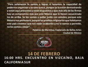«Pero solo lo vamos a lograr si tenemos la capacidad de podernos organizar y yo creo que si, porque ya lo están demostrando y están aquí presentes y están dispuestos a que más allá de las firmas hay un compromiso más por este Mexico que lo tienen secuestrado los de arriba. Se lo vamos a quitar junto con ustedes, porque este Mexico nos pertenece, porque los pueblos originarios que habitamos este país creemos que nos están acabando y no lo vamos a permitir, no los vamos a dejar». Palabra de Marichuy en la explanada de Bellas Artes, Ciudad de México.
