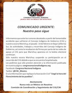 Informamos que ante los rumores desatados a partir del lamentable accidente que sufrieron el Concejo Indígena de Gobierno (CIG) y nuestra vocera Marichuy, el pasado 14 de febrero en Baja California Sur, las actividades, trabajos y recorridos del Concejo Indígena de Gobierno, así como la recabacion de firmas por parte de las redes de apoyo al CIG para que Marichuy aparezca en la boleta electoral continúan.