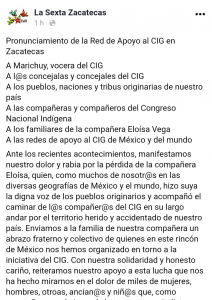 Ante los recientes acontecimientos, manifestamos nuestro dolor y rabia por la pérdida de la compañera Eloísa, quien, como muchos de nosotr@s en las diversas geografías de México y el mundo, hizo suya la digna voz de los pueblos originarios y acompañó el caminar de l@s compañer@s del CIG en su largo andar por el territorio herido y accidentado de nuestro país. Enviamos a la familia de nuestra compañera un abrazo fraterno y colectivo de quienes en este rincón de México nos hemos organizado en torno a la iniciativa del CIG. Con nuestra solidaridad y honesto cariño, reiteramos nuestro apoyo a esta lucha que nos ha hecho mirarnos en el dolor de miles de mujeres, hombres, otroas, ancian@s y niñ@s que, como nosotr@s, son víctimas de la tormenta capitalista que amenaza con destruir nuestras formas de vida.