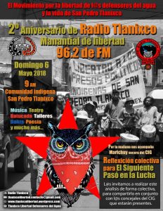Y ante la guerra que estamos viviendo, las radios comunitarias son muy importantes para este proceso de lucha y de resistencia, de romper el silencio y gritarle al mundo las injusticias que en este país vivimos los pueblos y las ciudades por igual, por ello la importancia de tejer comunicación y hermanar nuestras luchas, con Radio Tlanixco llevamos dos años desafiando al sistema capitalista que pretende mantenernos callad@s y sometid@s, mientras nos saquean y despojan de nuestros recursos naturales.