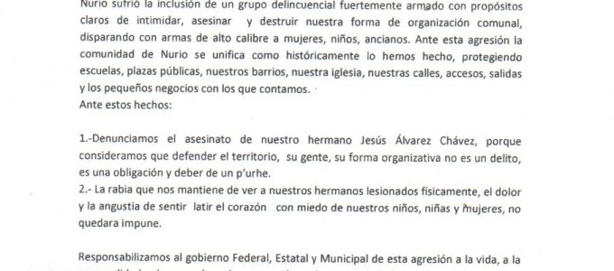 A la opinión pública Al Congreso Nacional Indígena Al Ejercicio Zapatista de Liberación Nacional A los medios de comunicación libres nacionales e internacionales A las comunidades indígenas hermanas de México y del mundo A la sociedad civil nacional e internacional Informamos que el día de ayer 22 de mayo del 2018, la comunidad indígena de … Sigue leyendo Denuncia de la Comunidad Purépecha de Nurio
