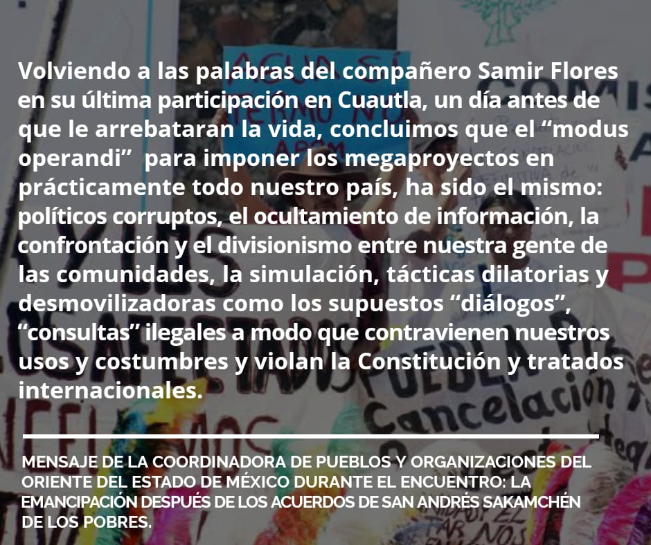 Mensaje de la Coordinadora de Pueblos y Organizaciones del Oriente del Estado de México durante el Encuentro: La emancipación después de los acuerdos de San Andrés Sakamchén de los Pobres.