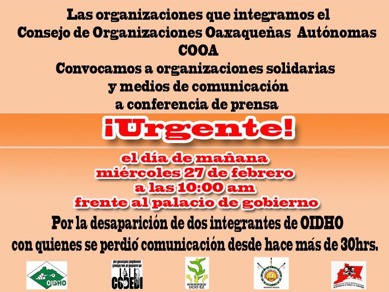 URGENTE: Organizaciones Indias por los Derechos Humanos en Oaxaca – OIDHO – denunciamos la desaparición…