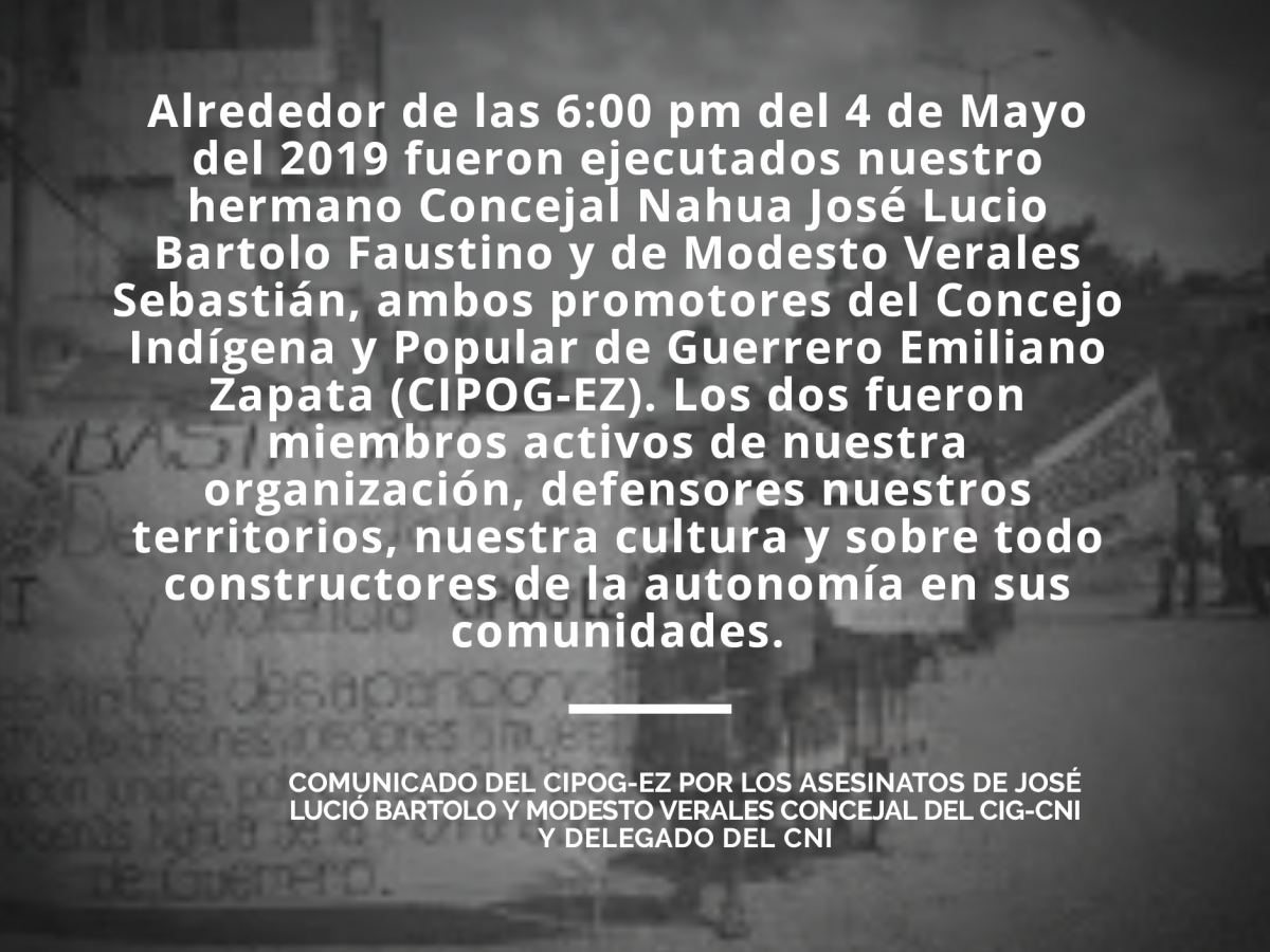 COMUNICADO DEL CONCEJO INDÍGENA Y POPULAR DE GUERRERO – EMILIANO ZAPATA (CIPOG-EZ), POR EL ASESINATO IMPUNE DE NUESTROS HERMANOS JOSÉ LUCIO BARTOLO FAUSTINO, Y MODESTO VERALES SEBASTIÁN