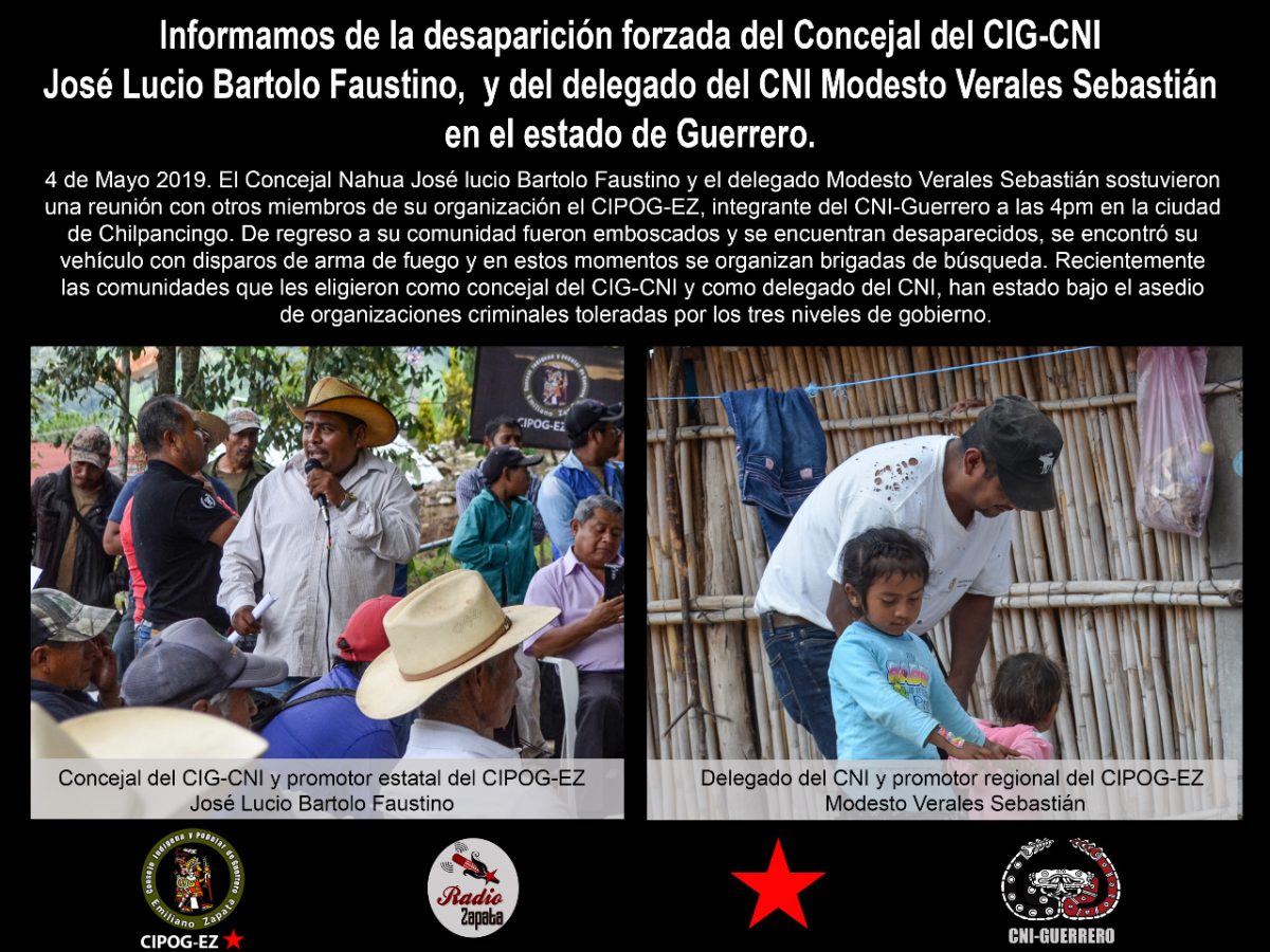 Informamos de la desaparición forzada del Concejal del CIG-CNI José Lucio Bartolo Faustino, y del delegado del CNI Modesto Verales Sebastián en el estado de Guerrero.