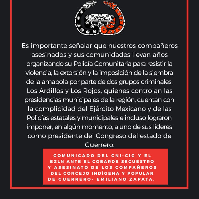 COMUNICADO DEL CNI-CIG Y EL EZLN ANTE EL COBARDE SECUESTRO Y ASESINATO DE LOS COMPAÑEROS DEL CONCEJO INDÍGENA Y POPULAR DE GUERRERO- EMILIANO ZAPATA.