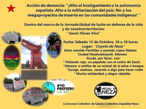 En el marco de la Jornada global de lucha en defensa de la Vida y de Nuestros Territorios “Samir Flores Vive” se convoca a “Acción de denuncia: ¡Alto al hostigamiento a la autonomía zapatista y no a los megaproyectos de muerte en las comunidades indígenas!”.