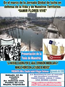 En el marco de la Jornada global de lucha en defensa de la Vida y de Nuestros Territorios “SAMIR FLORES VIVE” y en solidaridad con el Pueblo Kurdo y el Movimiento Indígena Popular de Ecuador en CDMX, se invita a la presentación de la tesis de maestría: La invisible guerra por el agua. Expansión inmobiliaria y manejo hídrico en la Ciudad de México. Maestra Claudia Isabel Villegas Cárdenas.