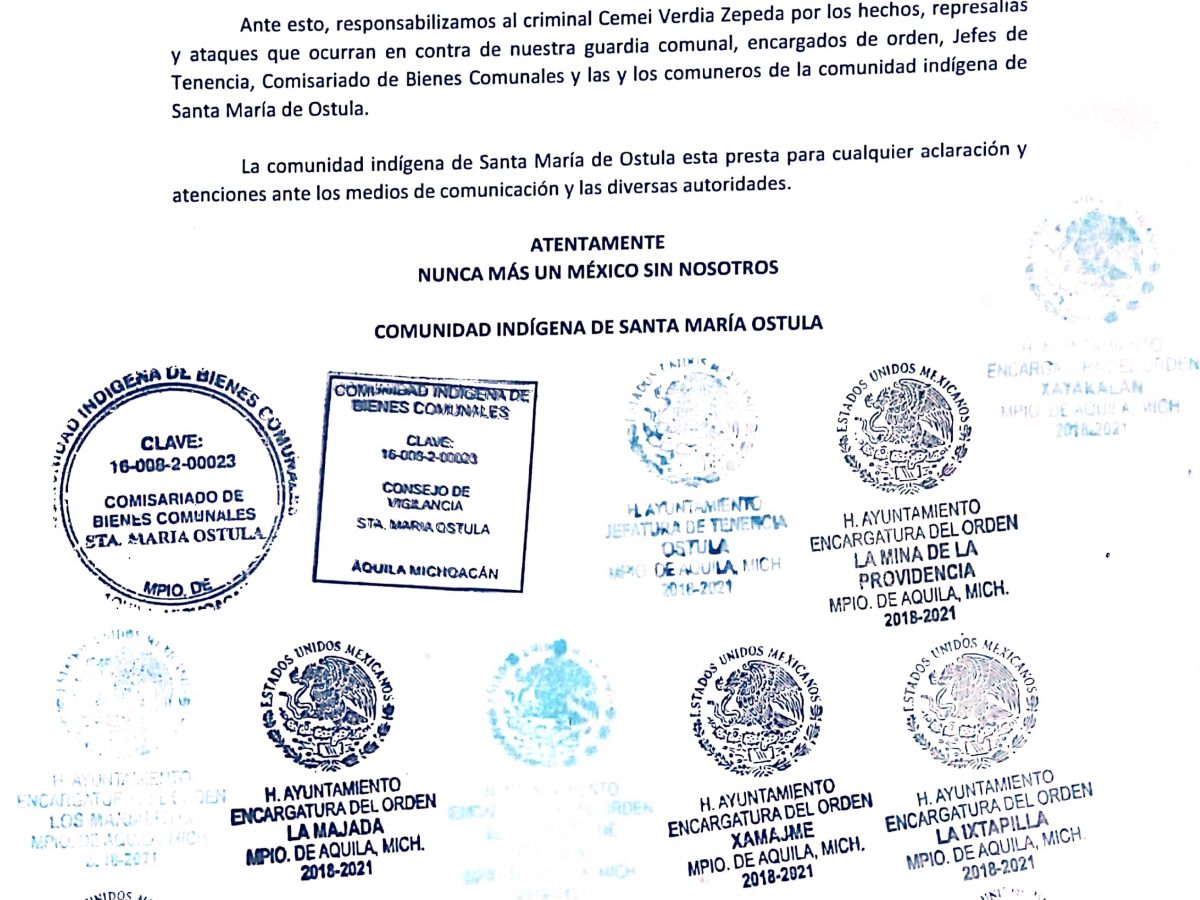 COMUNICADO POR EL QUE LA COMUNIDAD INDÍGENA DE SANTA MARÍA OSTULA ACLARA QUE EL TERRITORIO DE LA COMUNIDAD ESTÁ LIBRE DEL CRIMEN ORGANIZADO Y QUE EL GRUPO CRIMINAL DE CEMEÍ VERDÍA ZEPEDA BUSCA PROVOCAR VIOLENCIA E INESTABILIDAD CON FINES DELINCUENCIALES