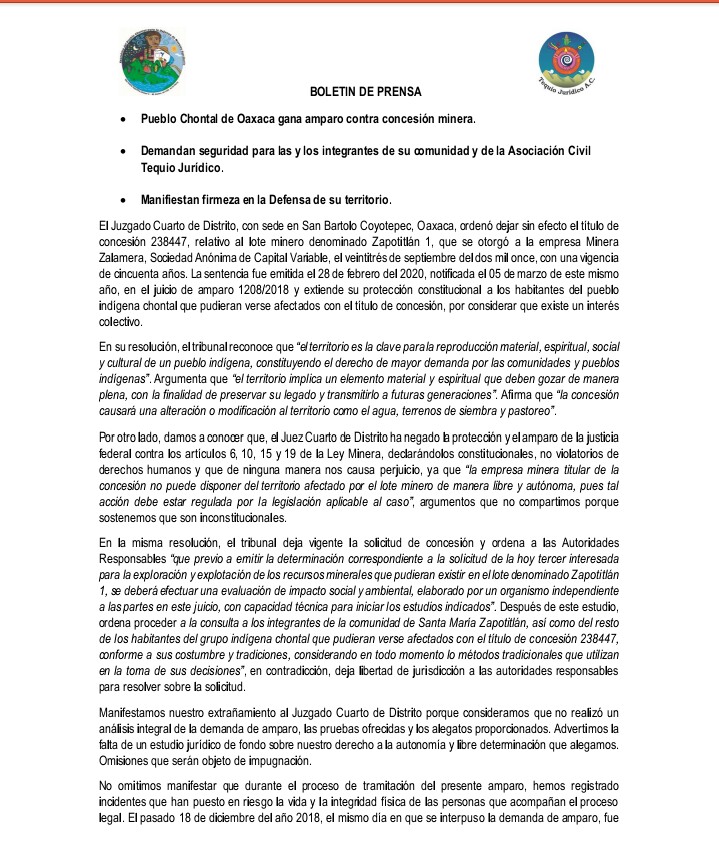 BOLETIN DE PRENSA -Pueblo Chontal de Oaxaca gana amparo contra concesión minera. – Demandan seguridad…