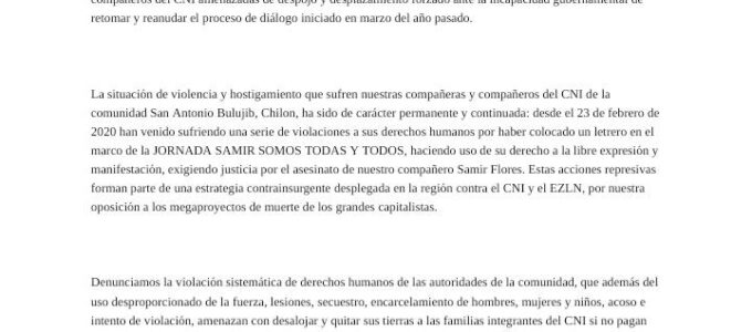 AL PUEBLO DE MEXICO A LAS REDES DE RESISTENCIA Y REBELDIA A LA SEXTA NACIONAL E INTERNACIONAL A LOS MEDIOS DE COMUNICACIÓN. A LOS ORGANISMOS DE DERECHOS HUMANOS. A LAS ORGANIZACIONES EN DEFENSA DEL TERRITORIO Y DE LA MADRE TIERRA. Alertamos de la inminente reactivación de la violencia en San Antonio Bulujib, contra … Sigue leyendo ALTO A LA VIOLENCIA PARAMILITAR EN SAN ANTONIO BULUJIB, CHILON, CHIAPAS