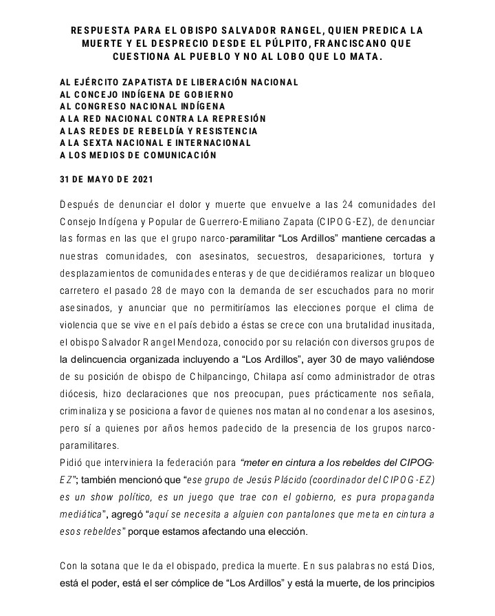 Palabras del CIPOG-EZ con motivo de la entrega del Informe: “CRIMENES DE LESA HUMANIDAD Y GRAVES VIOLACIONES A LOS DERECHOS HUMANOS CONTRA PUEBLOS INDÍGENAS DEL CIPOG-EZ CNI-CIG EN GUERRERO”.
