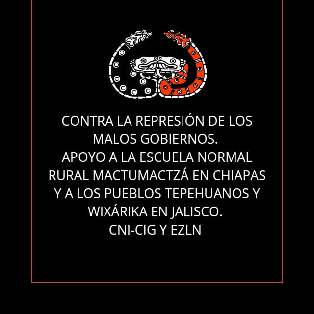 CONTRA LA REPRESIÓN DE LOS MALOS GOBIERNOS. APOYO A LA ESCUELA NORMAL RURAL MACTUMACTZÁ EN CHIAPAS Y A LOS PUEBLOS TEPEHUANO Y WIXÁRIKA EN JALISCO. CNI-CIG Y EZLN.