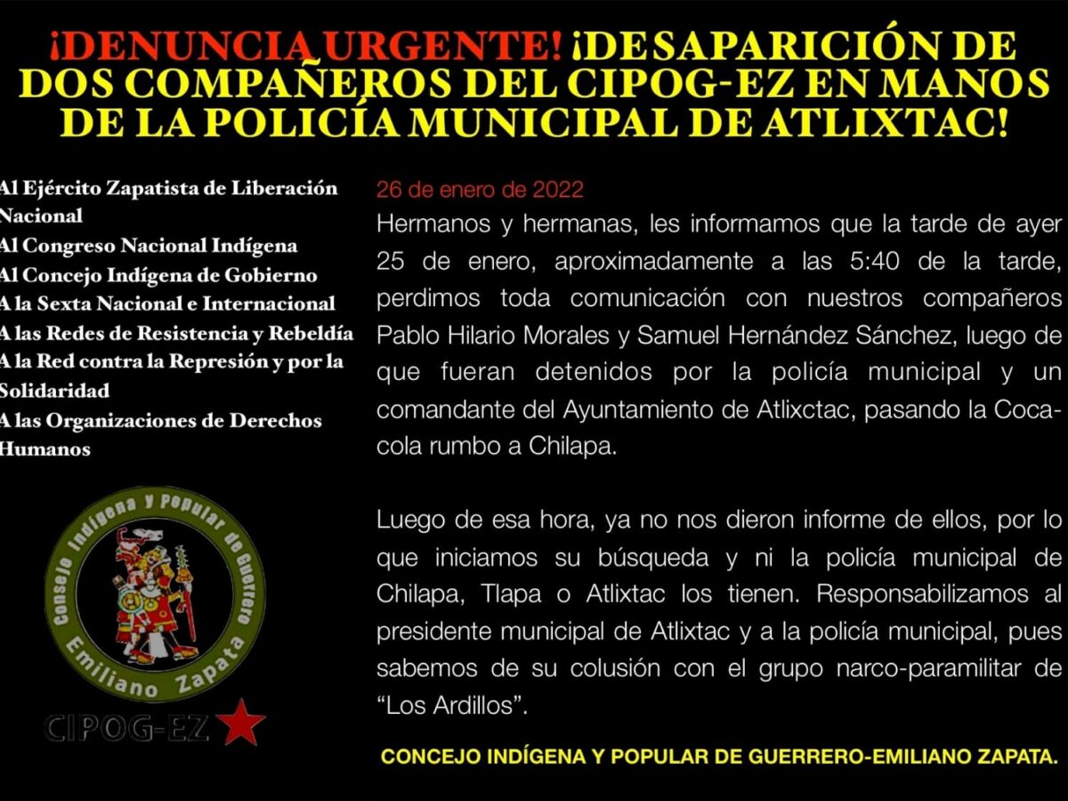 Denuncia urgente: Desaparición de dos compañeros del CIPOG-EZ en manos de la policía municipal de Atlixtac