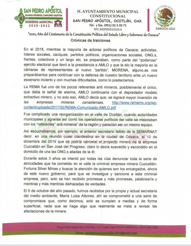 Comunicado de la Articulación por la vida, contra la minería del Valle de Ocotlan, Oaxaca. Crónicas de traiciones.