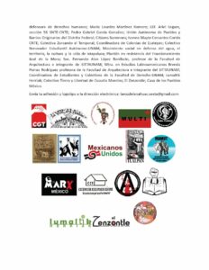 Colectivo CNI Totonacapan; La Voz del Anáhuac; Frente de Trabajadores por el Derecho a la Salud y Seguridad Social; Sector de Trabajadores del Campo y la Ciudad Adherentes a la Sexta; Confederación General del Trabajo (Estado Español); Movimiento de Unificación y Lucha Triqui Independiente; Dr. Gilberto López y Rivas profesor Investigador del INAH; Movimiento Autónomo Multisectorial Universal de Trabajadores MAMUT; Plantón de la Resistencia en Huexca Morelos; La Marx México; Colectiva Nuestra Alegre Rebeldía en Apoyo al CNI-CIG, Morelos: Colectivo Aequus.-Promoción y Defensa de Derechos Humanos; Coordinación de Familiares de Estudiantes Víctimas de la Violencia; Okupa ChiaPaz; Mexicanos Unidos; Red de Resistencia y Rebeldía Tlalpan; Colectivo Zapatista Neza; Coordinación Metropolitana Anticapitalista y Antipatriarcal con el CNI-CIG; Rocío Alvarado Tovar; Martha Eugenia Lechuga CNTE; Rosa Isela Martínez Martínez, activista y defensora de derechos humanos; María Lourdes Martínez Romero; LEF. Ariel Segura, sección 56 SNTE-CNTE; Pedro Gabriel García González; Unión Autónoma de Pueblos y Barrios Originarios del Distrito Federal; Citizens Summons; Ivonne Mayte Cervantes Cortés CNTE; Colectiva Zurcando el Temporal; Coordinadora de Colonias de Ecatepec; Colectivo Renovador Estudiantil Autónomo-UNAM; Movimiento social en defensa del agua, el territorio, la cultura y la vida de Ixtapaluca; Plantón en resistencia del Fraccionamiento José de la Mora; Soc. Fernando Alan López Bonifacio, profesor de la Facultad de Arquitectura e integrante de SITTAUNAM; Mtra. en Estudios Latinoamericanos Brenda Porras Rodríguez profesora de la Facultad de Arquitectura e integrante del SITTAUNAM; Coordinadora de Estudiantes y Colectivos de la Facultad de Derecho-UNAM; Lumaltik Herriak; Colectivo Tierra y Libertad de Cuautla Morelos; El Zenzontle; Casa de los Pueblos México.