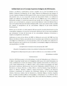 Quienes suscribimos manifestamos nuestro respaldo con las 68 Comunidades de los Pueblos Originarios Purhépechas de las Cuatro Regiones de Michoacán que integran el Consejo Supremo Indígena de Michoacán (CSIM), cuya movilización del día 02 de febrero del presente año, es una congruente muestra de descontento frente a la indiferencia estatal, que además de desatender a más de 150 mil indígenas que viven y trabajan en Michoacán mediante el control presupuestal que impide que este llegue a las manos de quienes son sus destinatarios, usurpa su representatividad por medio del elefante blanco que es el Instituto Nacional de Pueblos Indígenas INPI, mismo que a hecho todo lo posible por impedir el autogobierno de las comunidades indígenas al que tienen derecho históricamente.