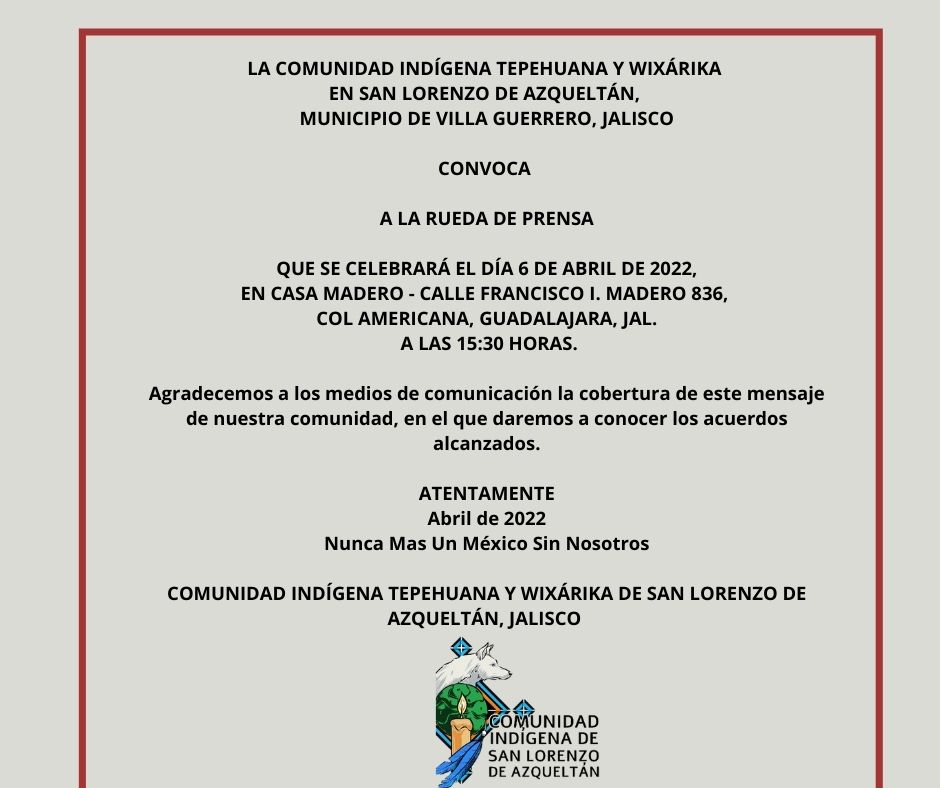 INVITACIÓN A RUEDA DE PRENSA DE LA COMUNIDAD INDÍGENA DE SAN LORENZO DE AZQUELTÁN, JALISCO, ANTE LA NUEVA INVASIÓN TERRITORIAL POR ESTUDIOS DE PROSPECCIÓN MINERA EN SU TERRITORIO Y SITIOS SAGRADOS