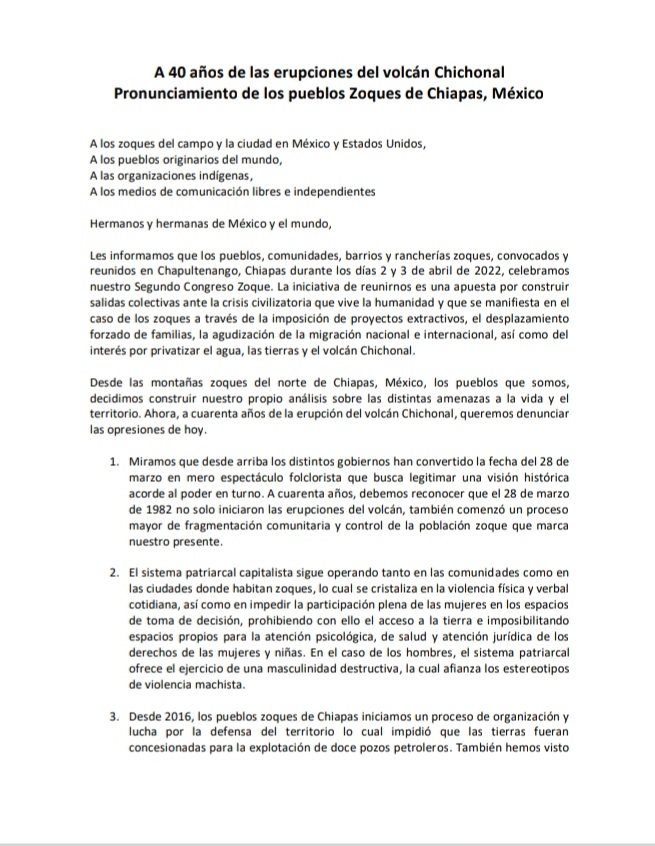 A 40 años de las erupciones del volcán Chichonal. Pronunciamiento de los pueblos Zoques de Chiapas, México