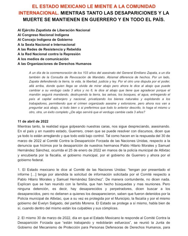 EL ESTADO MEXICANO LE MIENTE A LA COMUNIDAD INTERNACIONAL. MIENTRAS TANTO LAS DESAPARICIONES Y LA MUERTE SE MANTIENEN EN GUERRERO Y EN TODO EL PAÍS.
