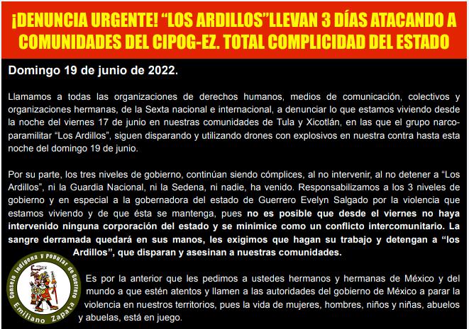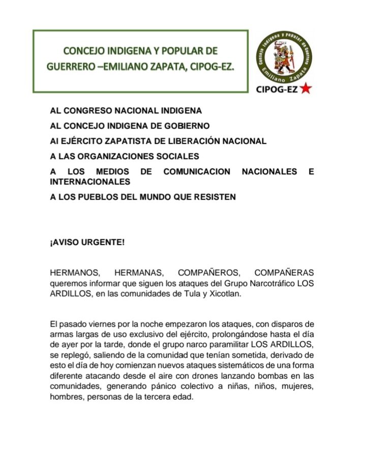 DENUNCIA DEL CIPOG-EZ POR EL ATAQUE CON EXPLOSIVOS POR PARTE DE LOS ARDILLOS EN LAS COMUNIDADES DE TULA Y XICOTLAN, GUERRERO