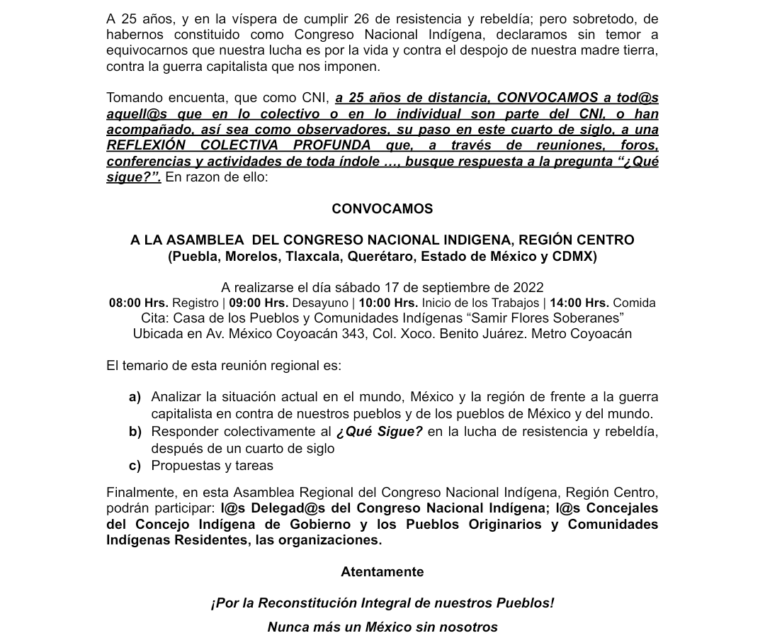 CONVOCATORIA A LA ASAMBLEA DEL CONGRESO NACIONAL INDIGENA, REGIÓN CENTRO (Puebla, Morelos, Tlaxcala, Querétaro, Estado de México y CDMX)