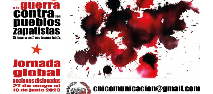ALTO A LA GUERRA CONTRA LOS PUEBLOS ZAPATISTAS Si tocan a un@ nos tocan a tod@s Jornada global Acciones dislocadas 27 de mayo al 10 de junio 2023 Participa en las acciones Registra tu actividad cnicomunicacion@gmail.com