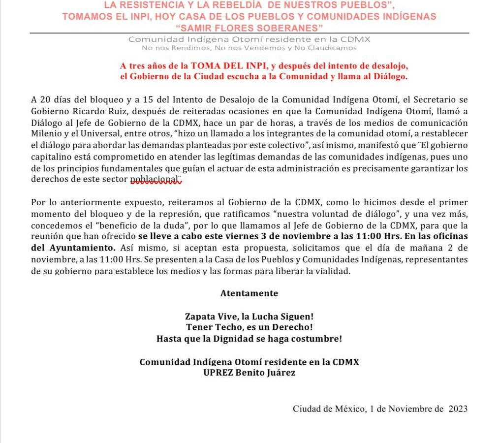 COMUNIDAD OTOMÍ RESIDENTE EN LA CDMX RATIFICA VOLUNTAD DE DIÁLOGO CON EL GOBIERNO DE E LA CDMX