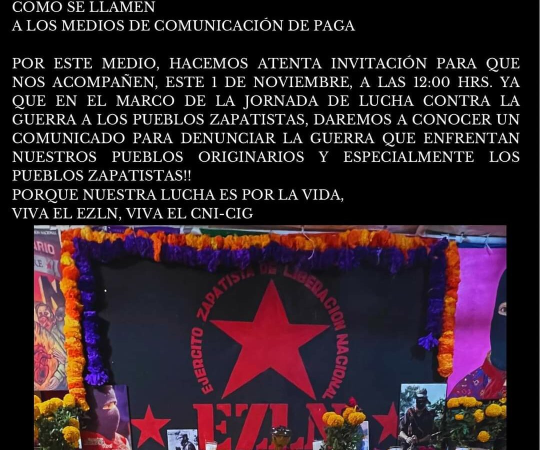 #OfrendaColectiva #ContralaGuerraalosPueblosZapatistas #Invitación: 1o de Noviembre 12:00 Hrs. A los medios libres, independientes, alternativos o…