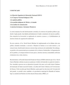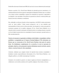 Nosotros, los mazatecos organizados en distintas colectividades y comunidades, sin fines partidistas y acompañados por el Congreso Nacional Indígena (CNI), declaramos con firmeza que no reconocemos al Lic. David García Martínez como parte de nuestra lucha.