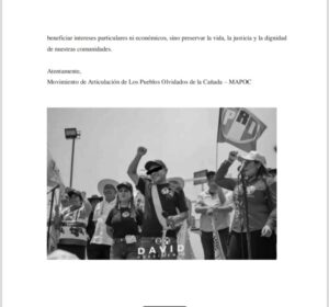 Asimismo, señalamos que cualquier intento de represión hacia nuestras comunidades o luchadores sociales responsabilizamos directamente al Lic. David García Martínez, a sus allegados políticos y al cabildo municipal que él encabeza.