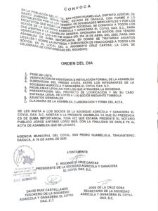 Denunciamos con firmeza y total rechazo la fraudulenta “Asamblea Ordinaria” de la Sociedad Agrícola y Ganadera El Coyul Oax. S.C. realizada el día 26 de abril de 2025, promovida por Rigoberto Cruz Cartas, quien carece de cualquier legitimidad sobre las tierras de la original Sociedad Agrícola Ganadera El Coyul fundada en 1972 por los verdaderos propietarios de las tierras que actualmente se encuentran en riesgo de ser despojadas y están siendo destruidas por Rigoberto y sus socios.