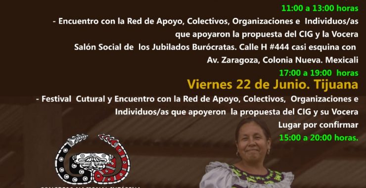 Jueves 21 de Junio 7 a 10 am: entrevistas con medios alternativos y comerciales de Mexicali. 11 a 13 horas: Encuentro con los pueblos indígenas de Baja California. Escuela Primaria del…