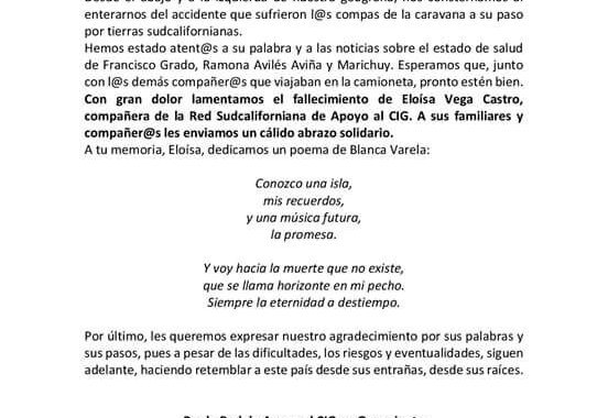 Al Congreso Nacional Indígena Al Concejo Indígena de Gobierno y nuestra vocera Marichuy A las redes y grupos de apoyo sudcalifornianos A la familia de la compañera Eloísa Vega Castro Nosotras…