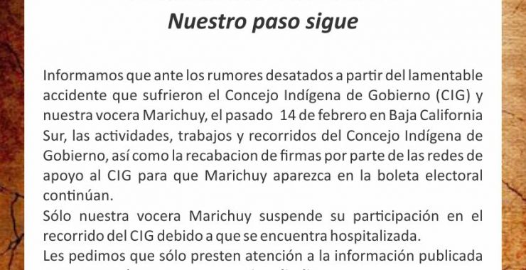 Informamos que ante los rumores desatados a partir del lamentable accidente que sufrieron el Concejo Indígena de Gobierno (CIG) y nuestra vocera Marichuy, el pasado 14 de febrero en Baja California Sur,…