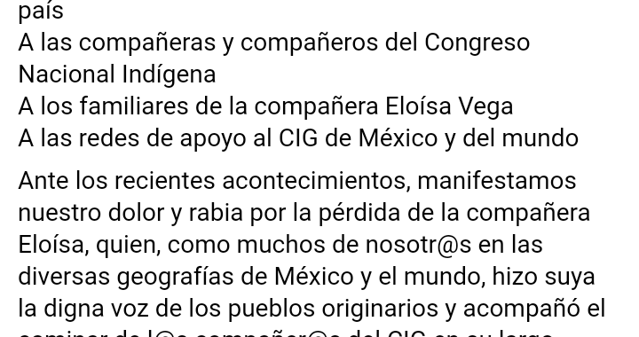 A la familia de la compañera Eloísa Vega Castro A las redes y grupos de apoyo Sudcalifornianos Hermanos, hermanas, a través de estas líneas, nosotras, nosotros quienes conformamos el Congreso Nacional Indígena…