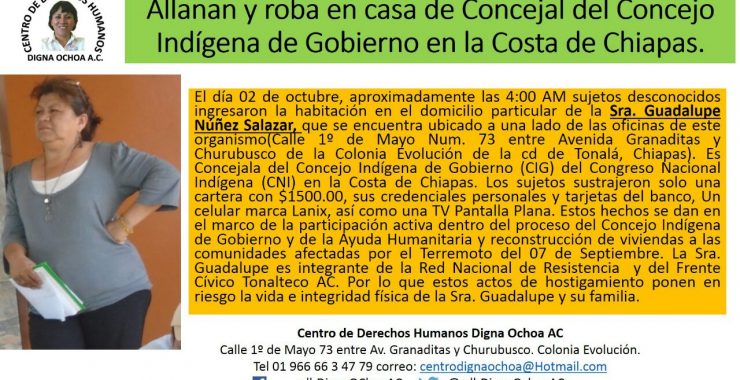 Tonalá, Chiapas a 03 de Octubre de 2017 AU-01 El día 02 de Octubre de 2017, aproximadamente a las 4:00 AM personas desconocidas allanaron y sustrajeron pertenecías en el domicilio particular…