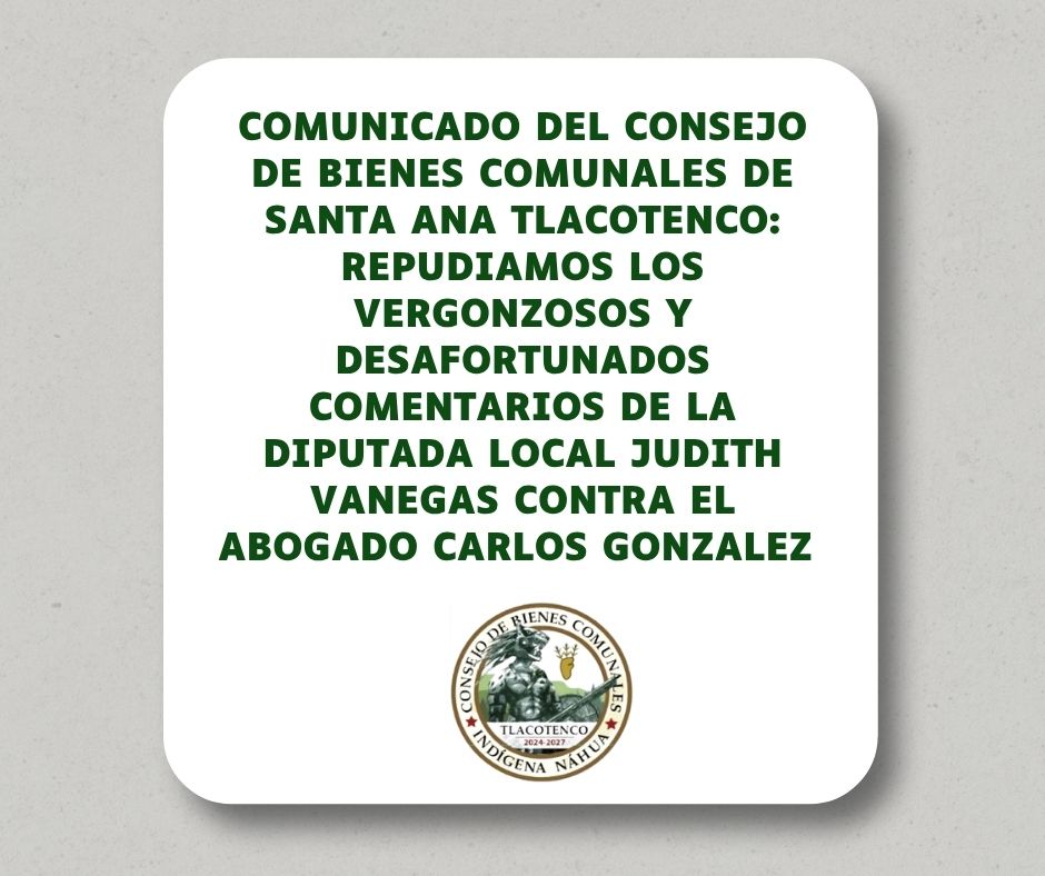 COMUNICADO DEL CONSEJO DE BIENES COMUNALES DE SANTA ANA TLACOTENCO: REPUDIAMOS LOS VERGONZOSOS Y DESAFORTUNADOS COMENTARIOS DE LA DIPUTADA LOCAL JUDITH VANEGAS CONTRA EL ABOGADO CARLOS GONZALEZ