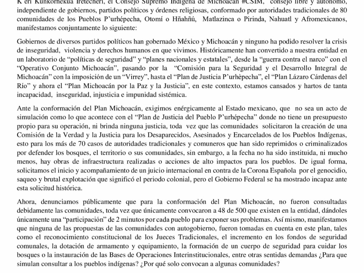 Al pueblo de México, A los pueblos originarios y comunidades en defensa de la vida…