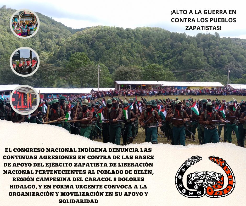 EL CONGRESO NACIONAL INDÍGENA DENUNCIA LAS CONTINUAS AGRESIONES EN CONTRA DE LAS BASES DE APOYO DEL EJÉRCITO ZAPATISTA DE LIBERACIÓN NACIONAL PERTENECIENTES AL POBLADO DE BELÉN, REGIÓN CAMPESINA DEL CARACOL 8 DOLORES HIDALGO, Y EN FORMA URGENTE CONVOCA A LA ORGANIZACIÓN Y MOVILIZACIÓN EN SU APOYO Y SOLIDARIDAD
