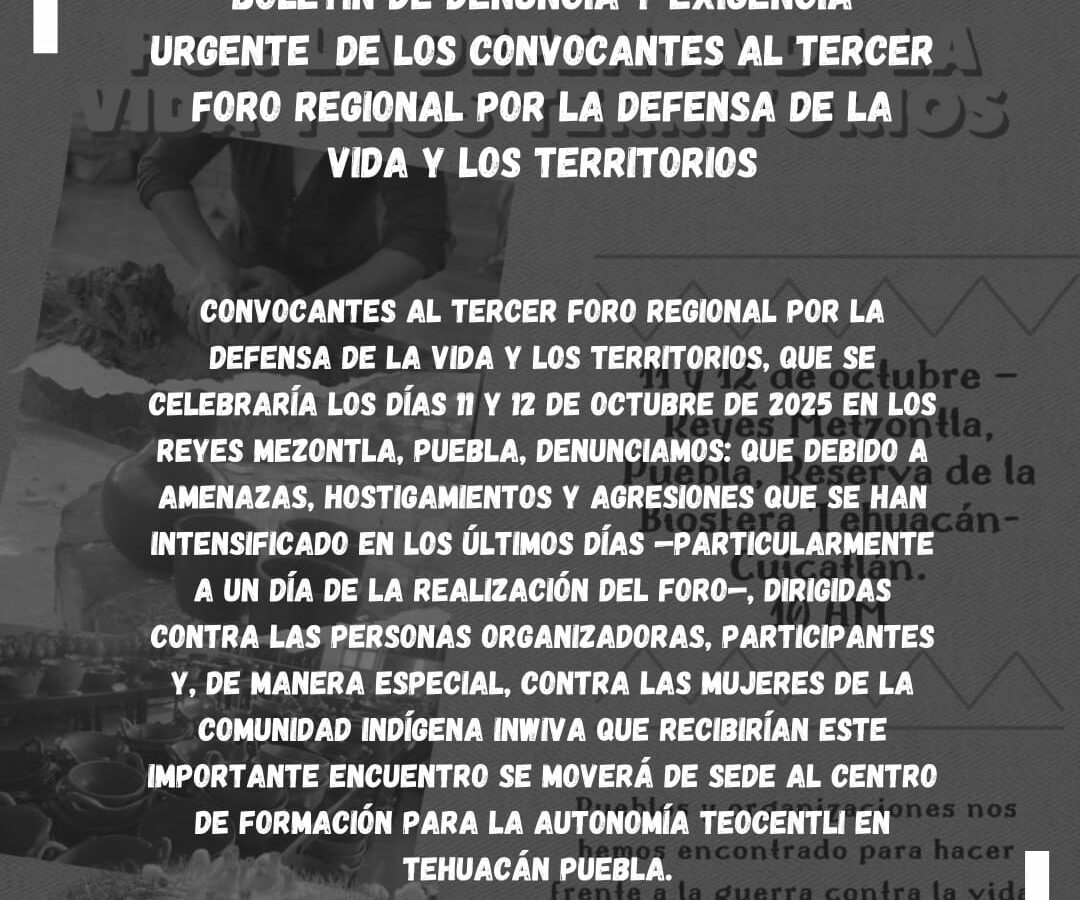 BOLETÍN DE DENUNCIA Y EXIGENCIA URGENTE DE LOS CONVOCANTES AL TERCER FORO REGIONAL POR LA DEFENSA DE LA VIDA Y LOS TERRITORIOS