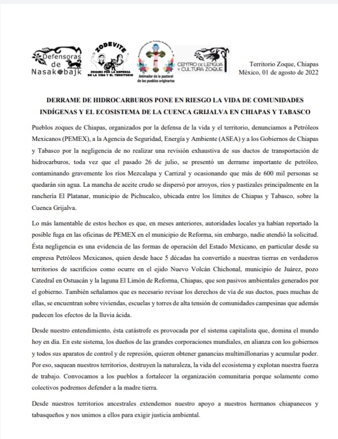 Pueblos zoques de Chiapas, organizados por la defensa de la vida y el territorio, denunciamos…