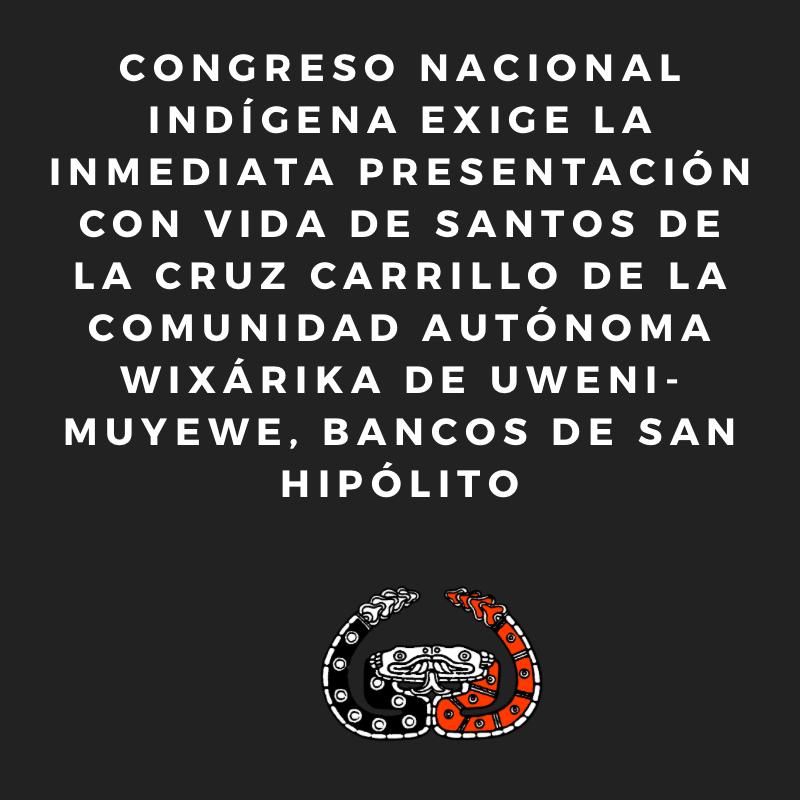 CONGRESO NACIONAL INDÍGENA EXIGE LA INMEDIATA PRESENTACIÓN CON VIDA DE SANTOS DE LA CRUZ CARRILLO DE LA COMUNIDAD AUTÓNOMA WIXÁRIKA DE UWENI-MUYEWE, BANCOS DE SAN HIPÓLITO