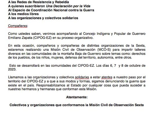 LLAMADO ACOMPAÑAR EL PASO DE UNA MISIÓN CIVIL DE OBSERVACIÓN DE LA SEXTA AL TERRITORIO DEL CIPOG-EZ