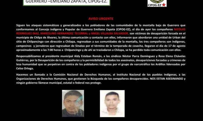 Dringender Aufruf des CIPOG-EZ. 18. August 2023. Die systematischen und generalisierten Angriffe auf die Bewohner*innen der Gemeinden der Montaña Baja in Guerrero, die wir den Concejo Indígena y Popular de Guerrero –…