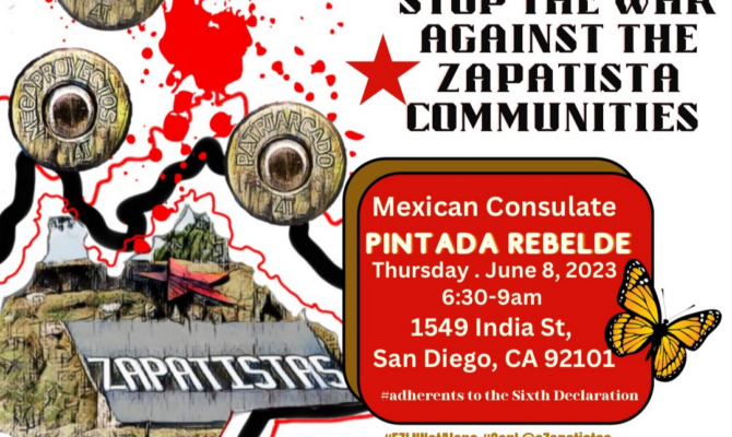 Alto a la guerra contra las comunidades zapatistas PINTADA REBELDE Consulado mexicano Jueves 08 de junio 06:30 a 09:00 am 1549 India St, San Diego, CA 92101 Convoca: Adherentes a la Sexta…